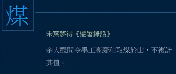 「煤」,《说文解字》不收,也是后起字。「煤」的意思是烧烟后剩下的灰,如煤灰,煤炱,古时在炉灶、烟囱、锅底,都可以收集到煤灰。